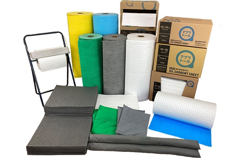 製品ラインナップは100アイテム以上を取り揃えており、お客様の用途や場所に合わせて、様々な特長を持った油吸収材をご提案します。